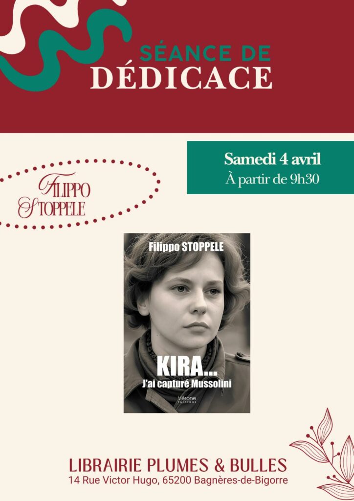 À l’occasion d’un moment littéraire unique, je vous propose de venir me rencontrer autour de mon ouvrage Kira… J’ai capturé Mussolini, lors d’une séance de dédicace organisée le samedi 4 avril à la librairie Plumes et Bulles à Bagnères de Bigorre.